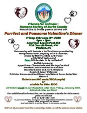 Friends For Animals – Humane Society of Burke County invites you to celebrate Valentine’s Day with an evening of great food, music, and love for animals! Join us on Friday, February 13, 2026, from 6:00–9:00 PM at the American Legion Post 234 in Valdese for a special Valentine’s Dinner benefiting the animals in our care.